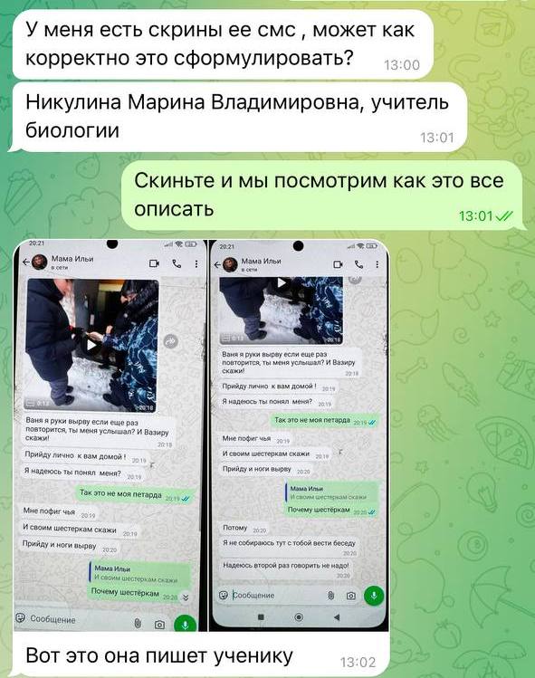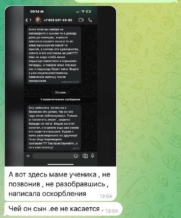 «Если вы завтра не поговорите с сыном, то я доведу дело до полиции. Хотите, я его поставлю на учет??? Мне не надо, чтобы в моем подъезде пакостили и взрывали петарды, и писали моему сыну, что ему, как и подъезду, будет хана», - пришло сообщение с номера телефона педагога. А через некоторое время поступило и второе сообщение.