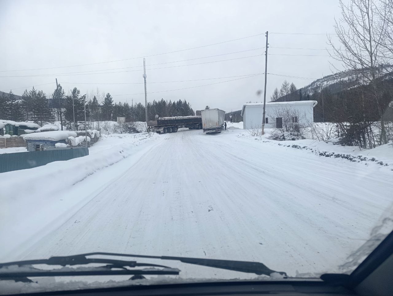 Грузовик-большегруз врезался в фуру. Дорога, естественно, нечищеная в принципе и представляет, надо полагать из себя каток, от которого даже самая лучшая зимняя резина не всегда спасает.